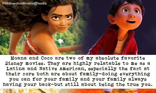 Moana and Coco are two of my absolute favorite Disney movies. They are highly relatable to me as a Latina and Native American, especially the fact at their core both are about family-doing everything you can for your family and your family always having your back-but still about being the true you.