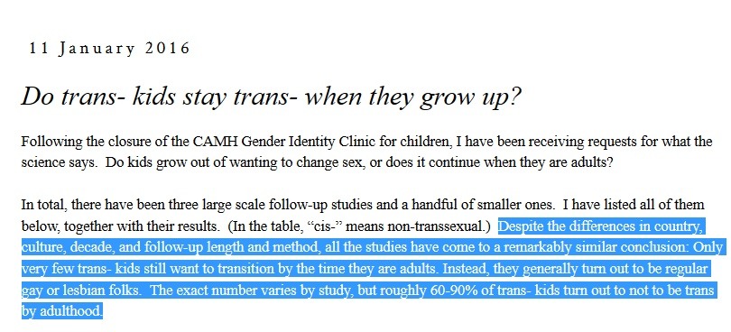 Of course, nowadays, we’re influencing kids to STAY trans by “socially transitioning” them, using “preferred pronouns,” and puberty blockers. Wouldn’t it be interesting to just leave them alone instead of reassuring them that they really ARE the opposite sex, given how high the medical stakes are?